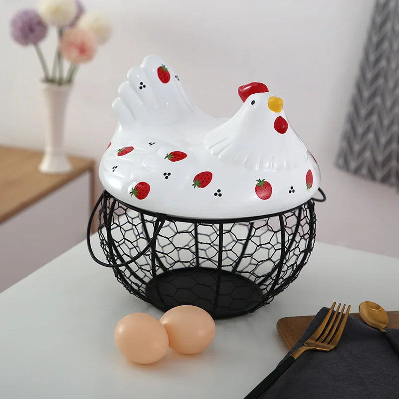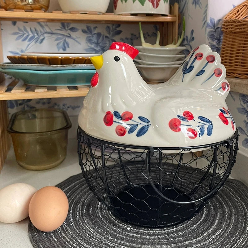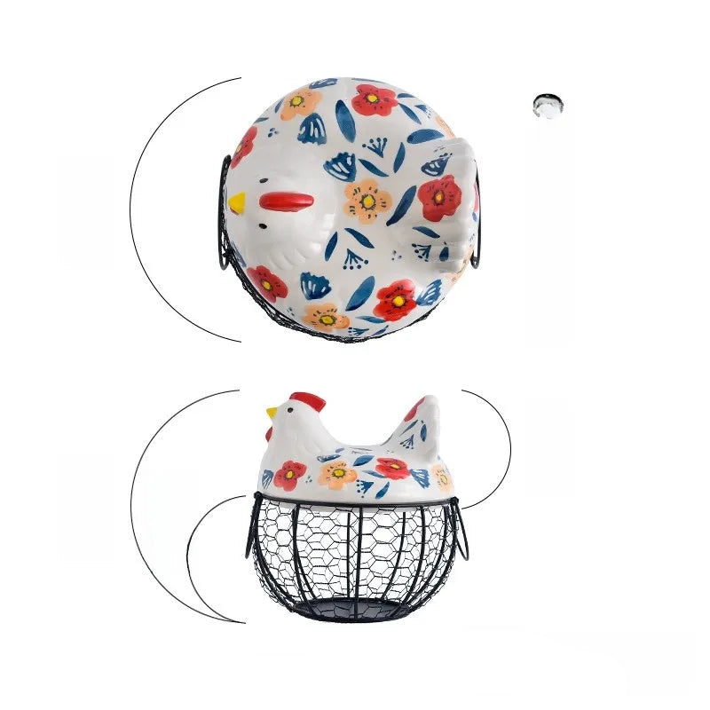 Este porta ovos foi cuidadosamente projetado para combinar a delicadeza da cerâmica de alta qualidade com a robustez e o toque rústico do ferro. O design em formato de galinha não só adiciona um elemento decorativo único e acolhedor, mas também serve como um sistema inteligente para armazenar seus ovos de forma segura, evitando que rolem ou quebrem, e facilitando o controle do seu estoque. Seus ovos ficarão visíveis, organizados e prontos para serem usados em suas receitas favoritas!